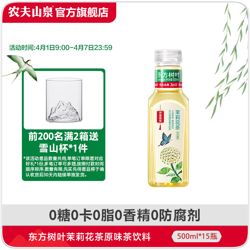 农夫山泉东方树叶茉莉花茶500ml*15瓶无糖茶饮料0糖0脂0卡整箱装
