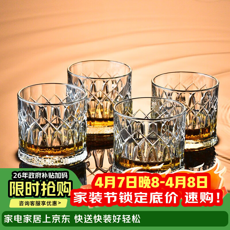 Ocean泰国进口玻璃威士忌酒杯烈酒杯洋酒杯玻璃杯套装花纹款350ml4只