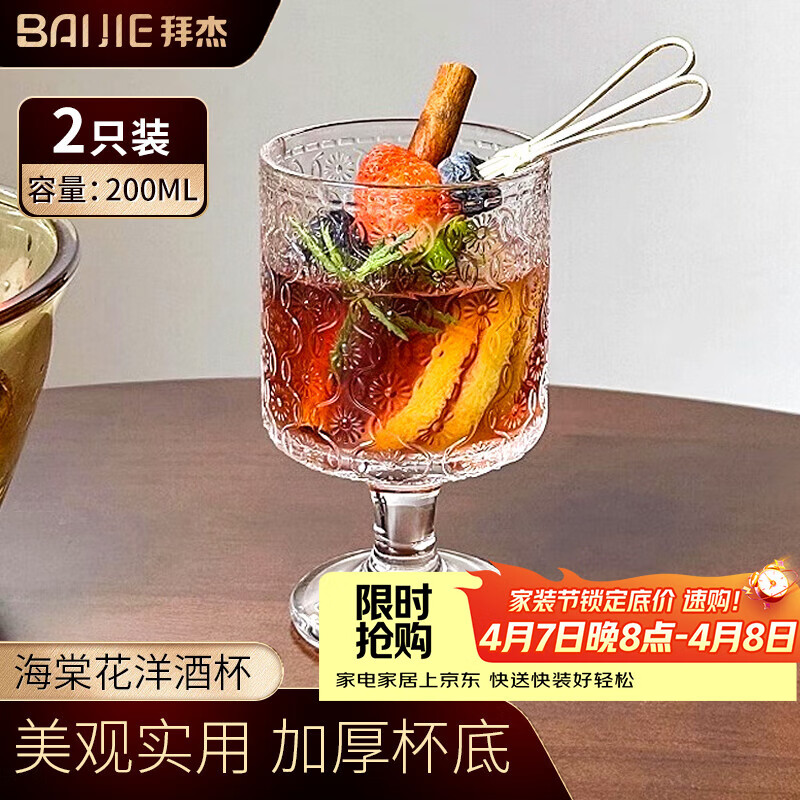 拜杰玻璃杯威士忌酒杯热红酒杯洋酒杯高脚杯高颜值鸡尾酒杯200ml2只装