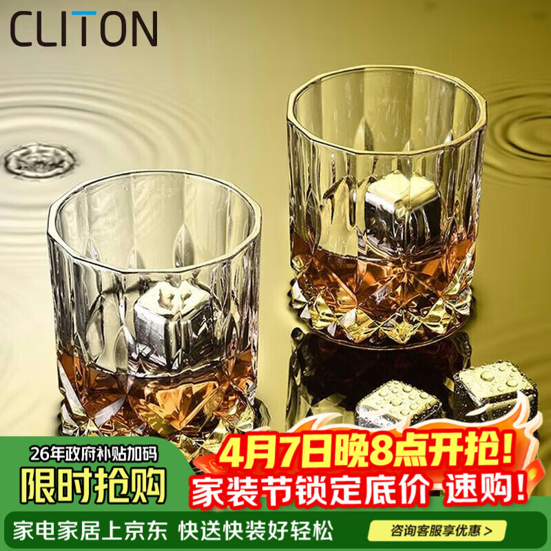 CLITON 玻璃威士忌酒杯 欧式雕花烈酒杯洋酒杯家用水杯玻璃杯套装 2只装