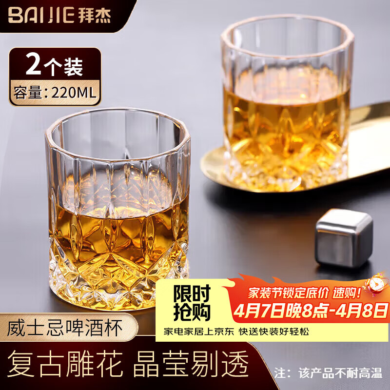 拜杰玻璃威士忌酒杯 欧式雕花烈酒杯洋酒杯家用水杯玻璃杯套装 2只装